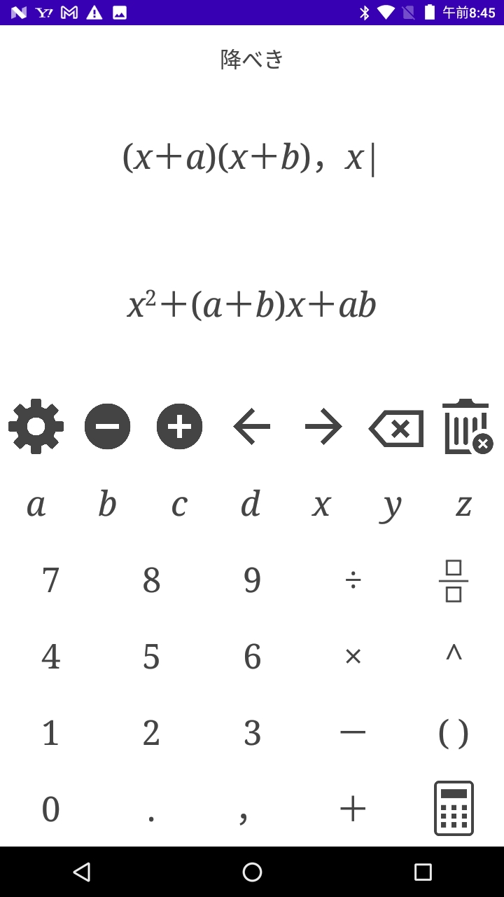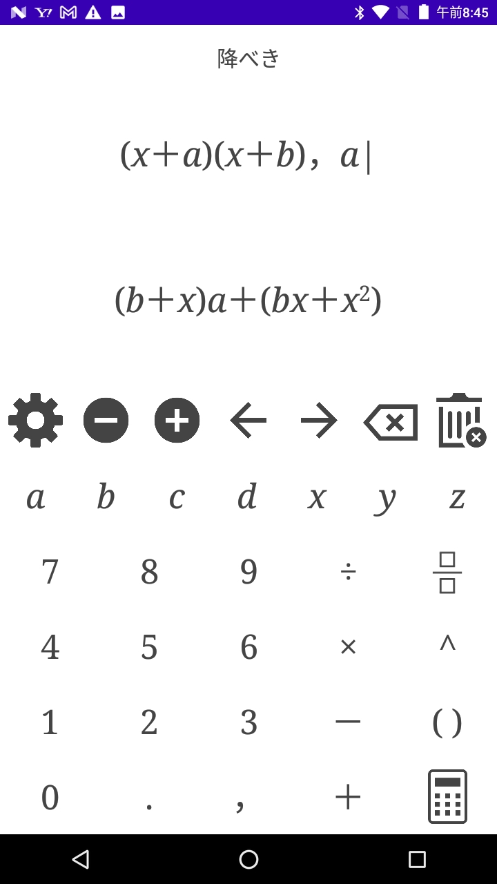 例 (x+a)(x+b)をxについて降べきの順に整理する 入力式 「 (x+a)(x+b),x 」戻る 例 (x+a)(x+b)をaについて降べきの順に整理する 入力式 「 (x+a)(x+b),a 」
