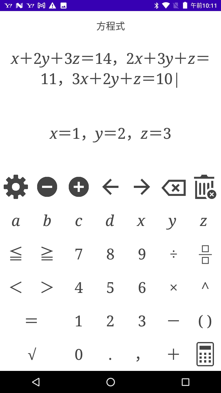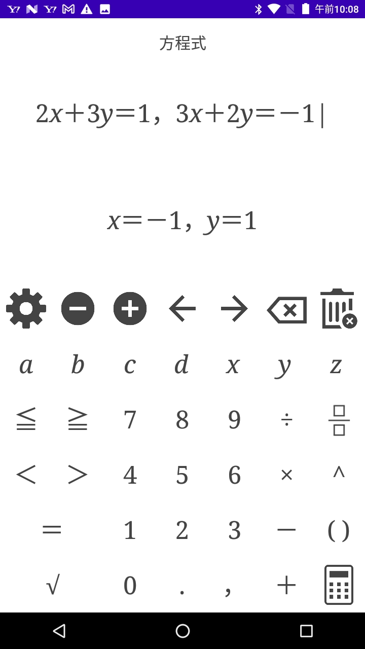 電卓アプリ「文字式の電卓・因数分解・方程式・不等式」 連立方程式 連立不等式 降べき 代入